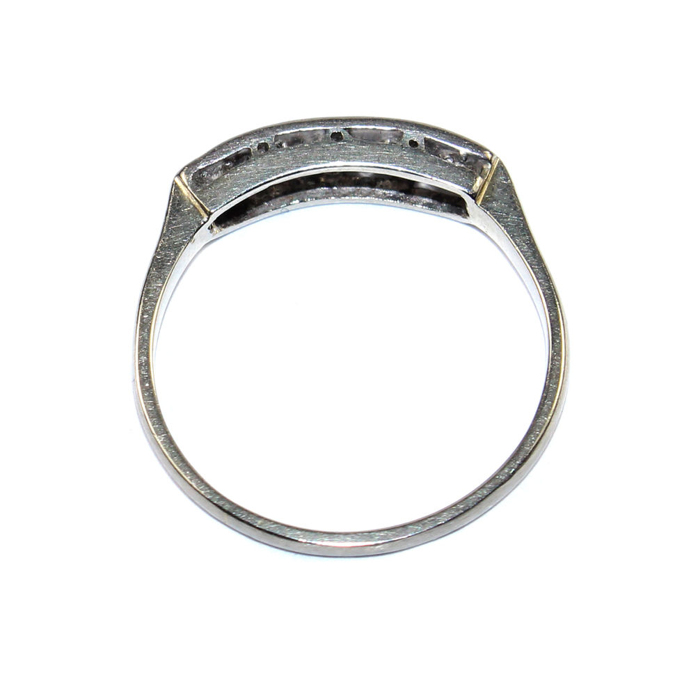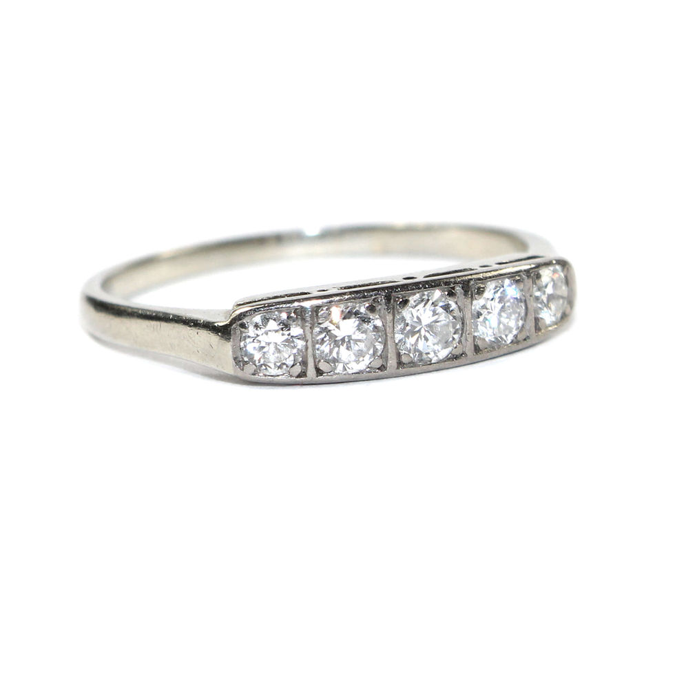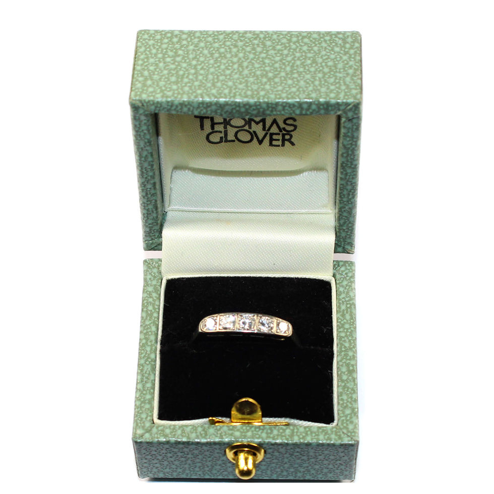 This lovely ring has 5 beautifully matched slightly graduated diamonds in a simple rub-over setting. The ring is low set on the finger with a simple chenier detailing to the gallery and plain shoulders onto a plain shank.
