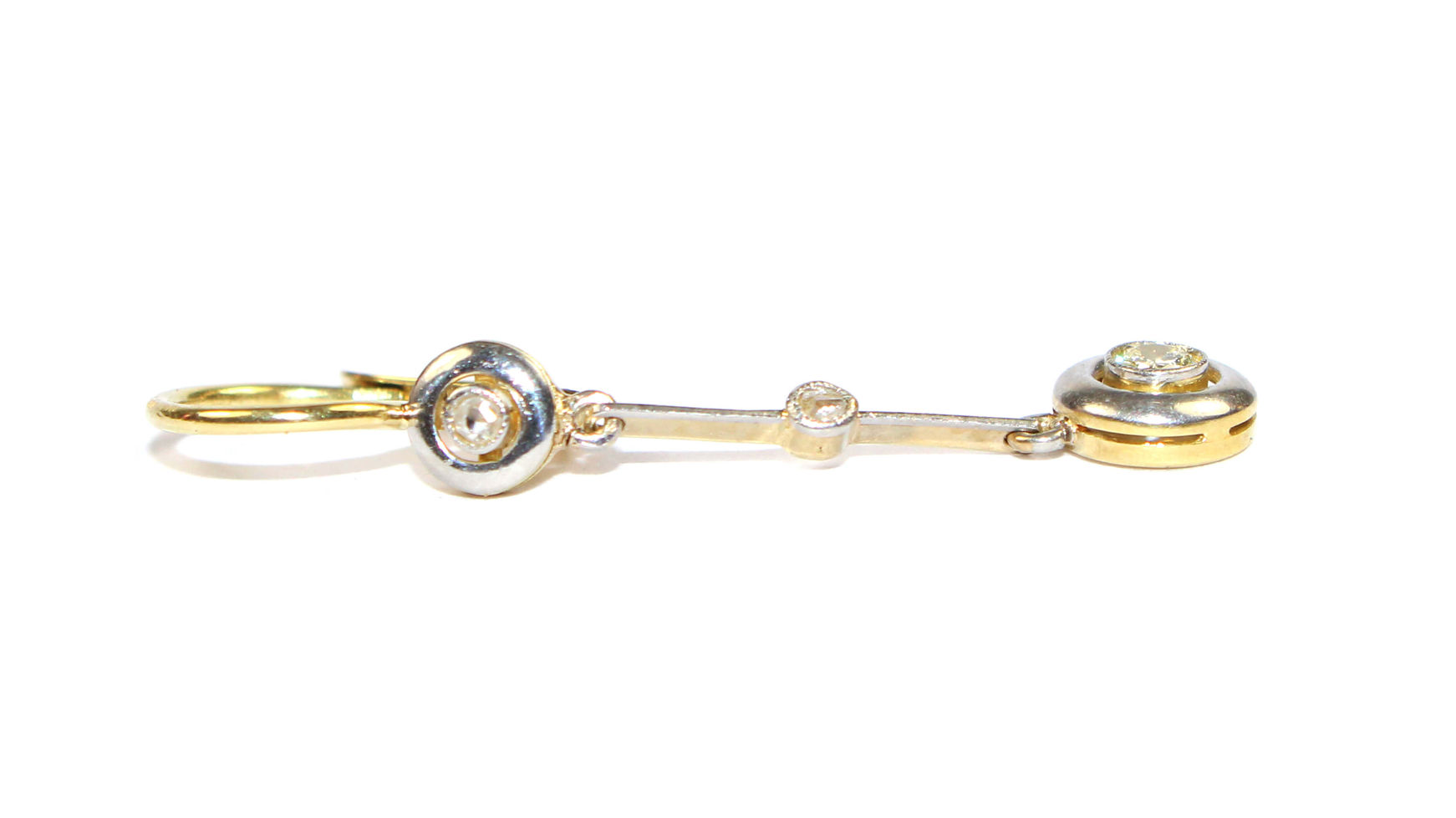 A pretty pair of late Edwardian diamond drop earings. These beautiful earrings have 2 diamonds each mounted in an outer rub over border making them appear larger than they are. They are joined by a 'knife-edge' bar set with a small diamond to the centre. This gives the impression that the diamonds are floating when worn. The earrings are in fronted in platinum with yellow gold backs, they are fully articulated and are beautifully made. They have sprung hook fittings which keep the earrings safe when worn. These earrings are incredibly wearable, perfect for any occasion. Era: Art Deco, 1925 - 1940 Measurements: Earrings 3.5cm in length from top of hook, hook is 0.6cm from top of diamond. Total diamond weight estimated 0.30 carats Hallmarks: Unmarked - tests as platinum & gold