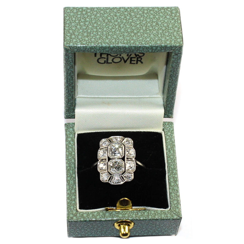The 'tablet' design ring has 2 large old cut diamonds set to the centre surrounded with a border of slightly smaller old cut diamonds. The diamonds are in a milgrain setting.