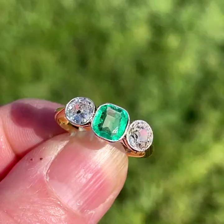 Art Deco Emerald & Diamond 3 Stone Ring c.1925