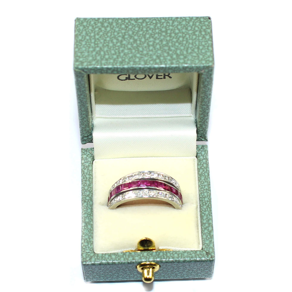 The ring has a half hoop of square cut sapphires to one side with a half hoop of square cut rubies to the other.