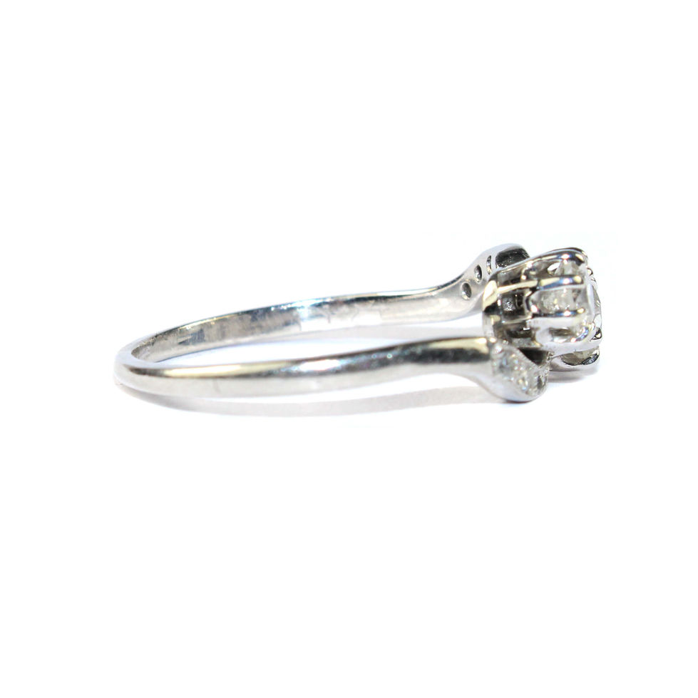 This classic design has 2 transitional cut diamonds mounted on a twist with diamond set shoulders. The main diamonds are 8 claw set within a coronet mount open to the reverse. The tapered shoulders each have small diamonds set into them and they flow onto a plain platinum shank.