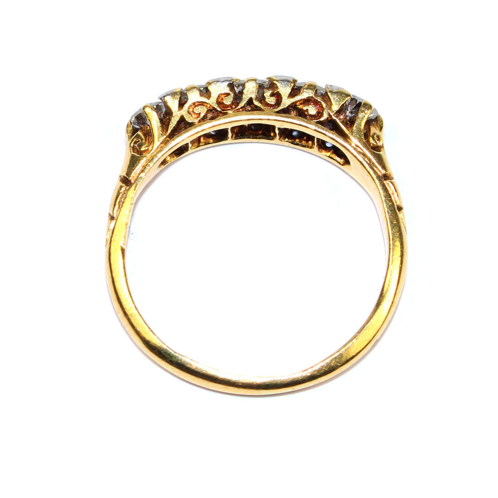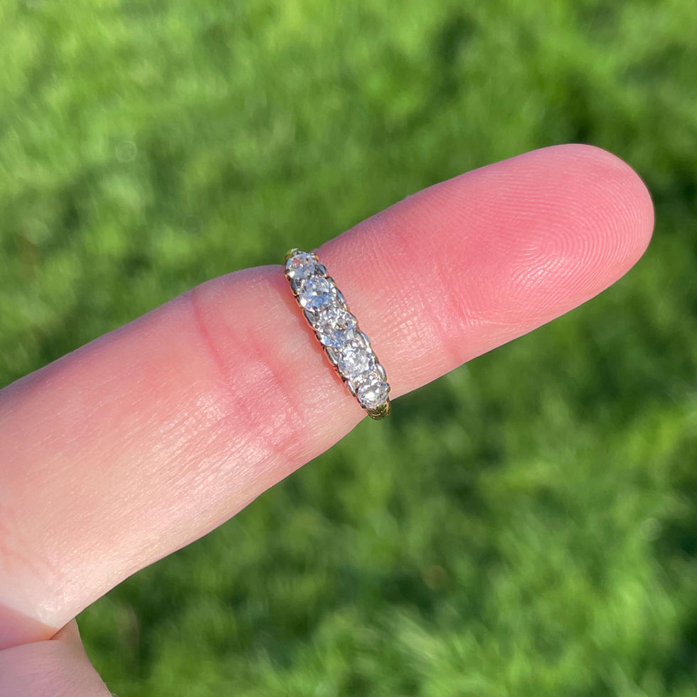 This elegant ring has 5 slightly graduated brilliant cut diamonds set tightly together giving the impression of a continual line. The ring has tiny diamond points between the main diamonds It would make a beautiful engagement ring as it is perfect for everyday wear.