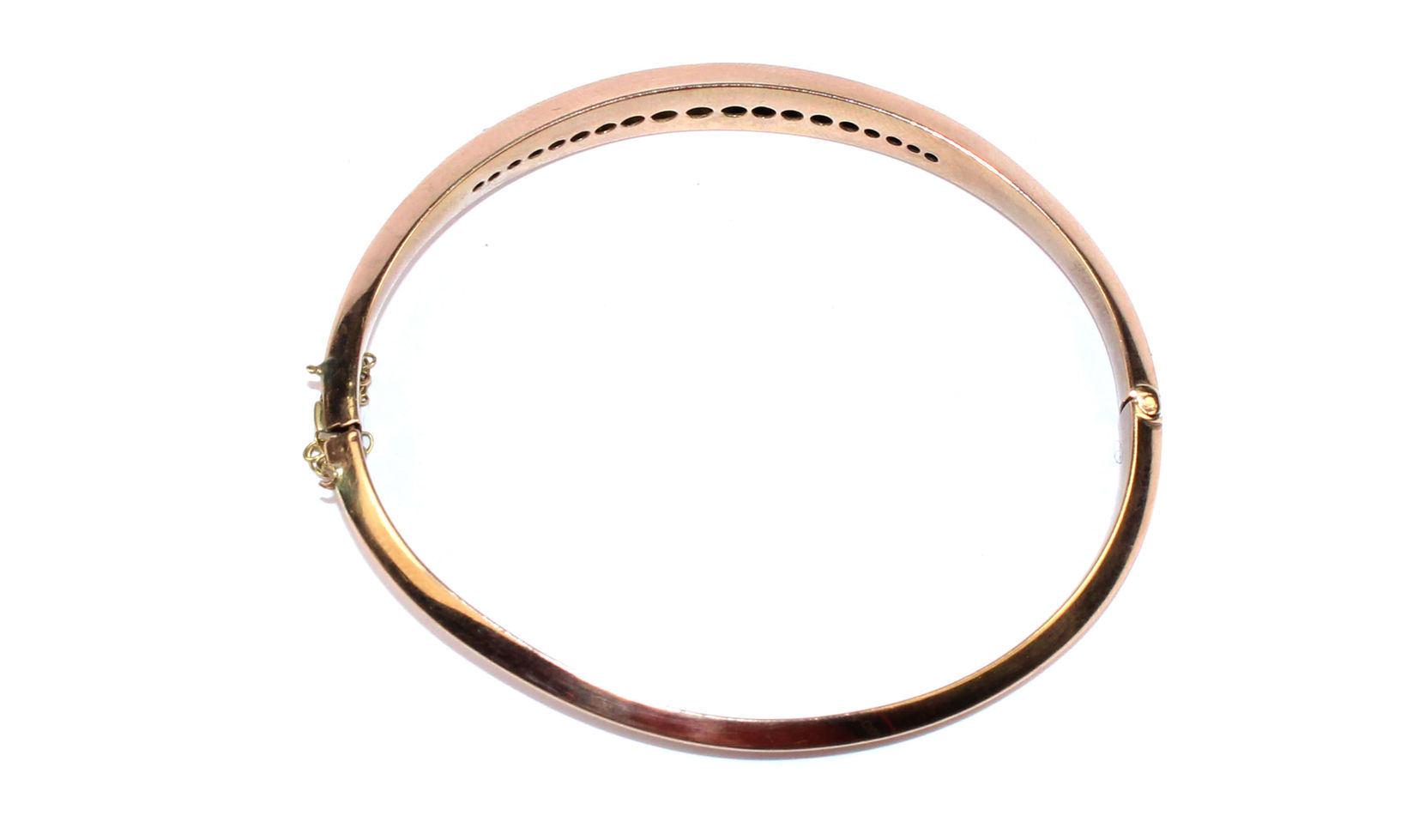 This beautiful rose gold bangle has a graduated row of 17 old cut diamonds in a fine silver setting within a smooth eliptical bangle. Each diamond is mounted in a spitch setting and is slightly lower than the rose gold border making the bangle smooth to the touch.