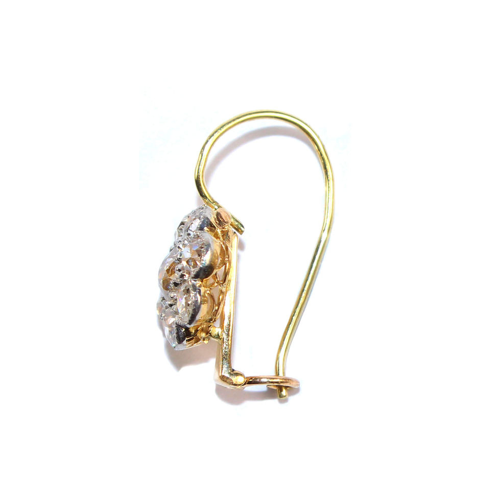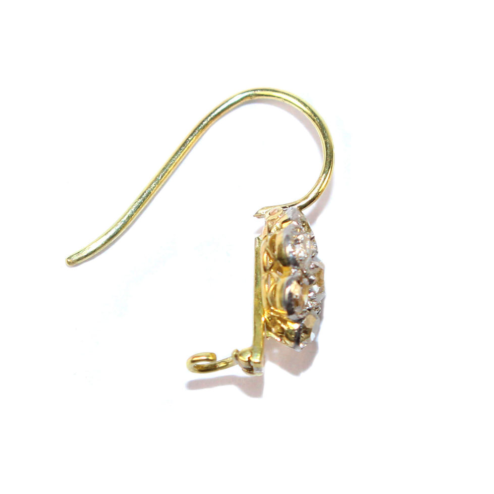 The earrings have an old cut diamond to the centre surrounded by 7 smaller old cut diamonds in a daisy cluster design. The earrings are fronted in platinum with a fine milgrain edge. They have a fine gold underbezel with gold hook fittings.