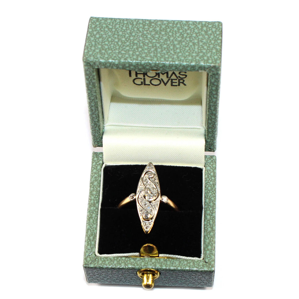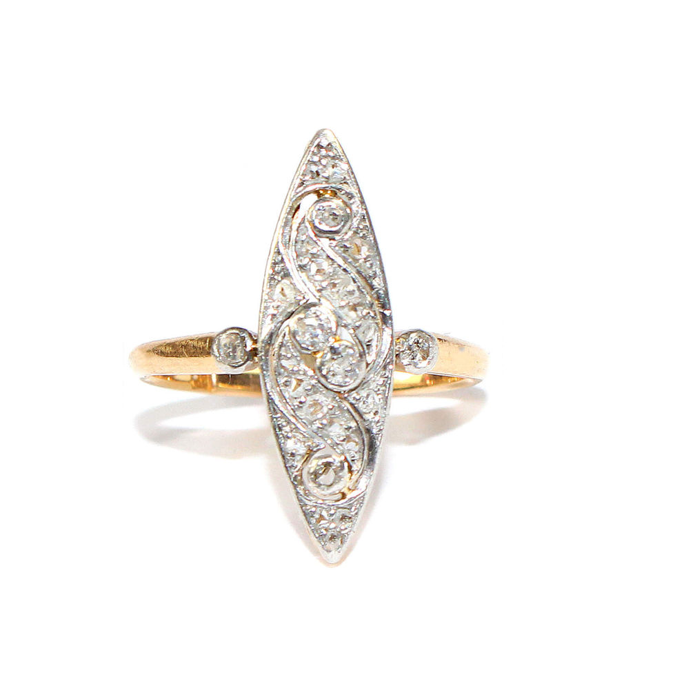 This elegant ring is designed as an elongated navette (marquise) shape with a central diamond set double scroll within an outer diamond set border.