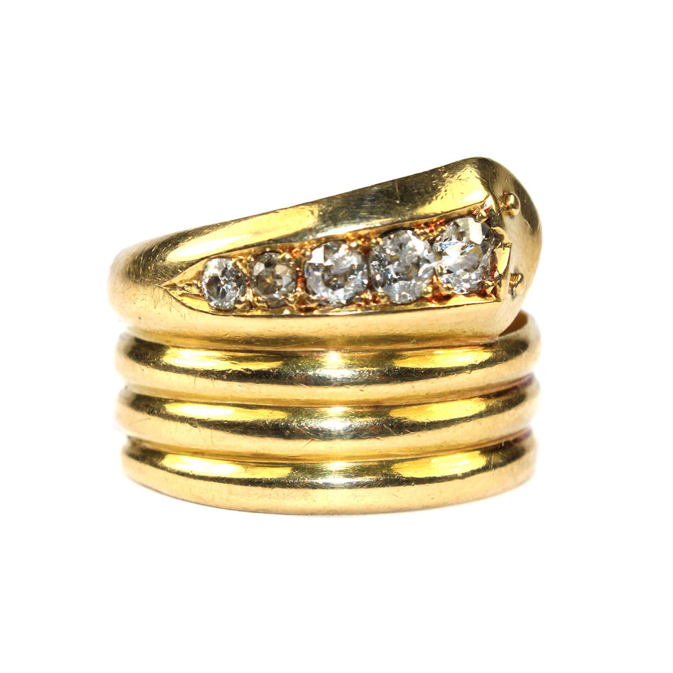 The ring with a realistically modelled triple coiled snake has 5 old-cut diamonds set in a tapered band across the head.