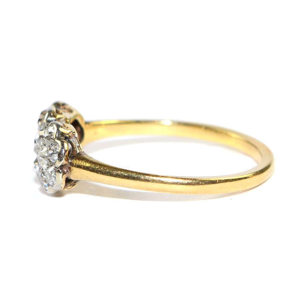 An intricate design of 3 intertwined diamond set 'daisy' clusters make up this beautful ring. Each cluster has an old cut diamond to the centre surrounded by smaller diamonds in a tightly packed design. The impression is of a contiunal diamond band making the stones look larger than they really are when viewed from a distance.