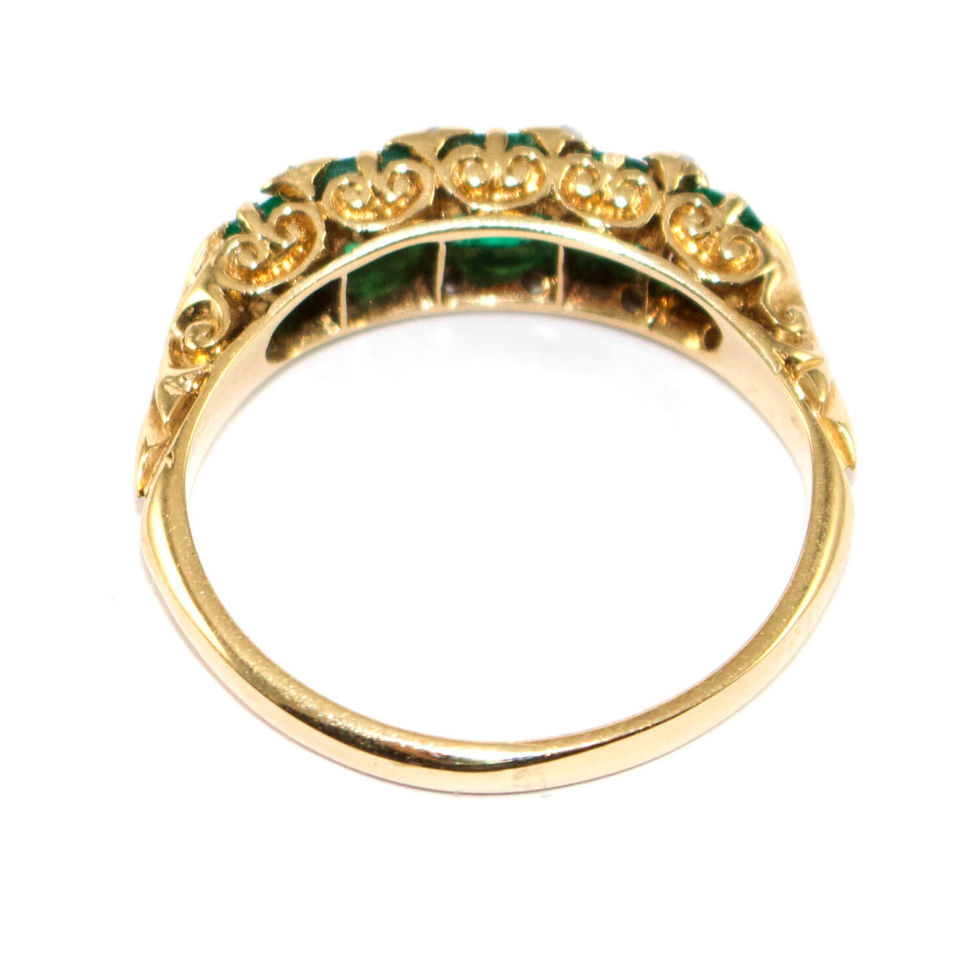 This wonderful ring has 5 graduated emeralds in a carved half hoop setting. The emeralds have a tiny diamond point set in between each stone typical of rings of this design.