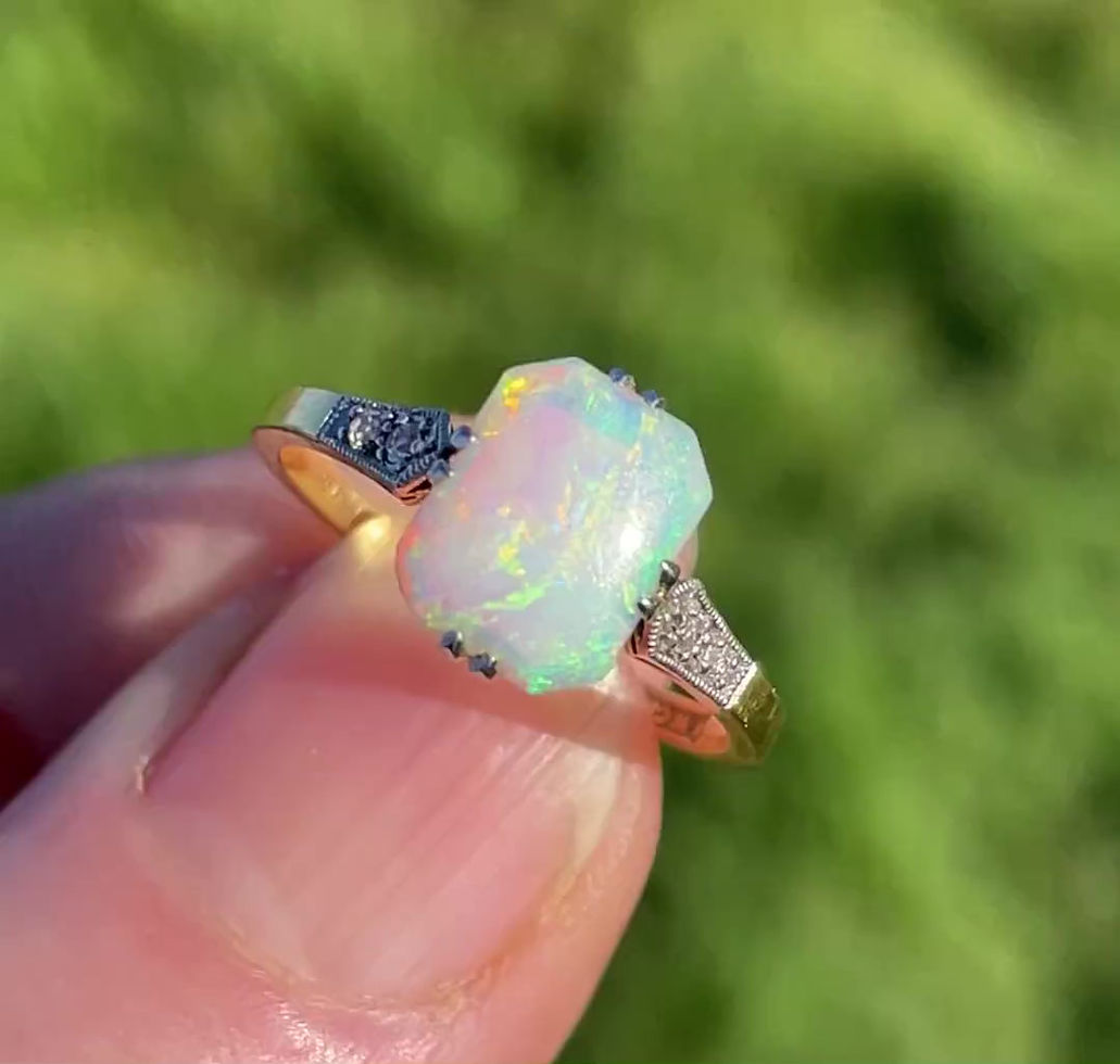 This stylish ring has an unusual cut cornered cabochon opal in a fine 4 double claw mount. The ring has beautiful tapered platinum faced shoulders each set with 2 small diamonds within a milgrain setting. The shoulders flow onto a plain gold shank. The ring is low set to the hand typical of the era.