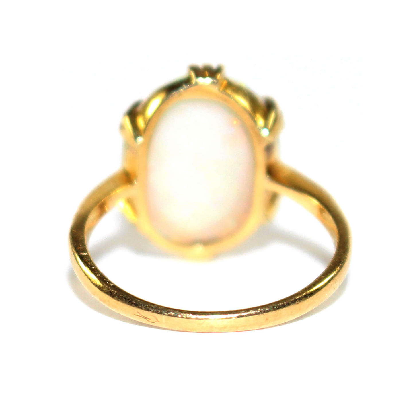 The ring has a large cabochon opal finely mounted in a 6 triple claw set mount open to the reverse with a low plain bezel.