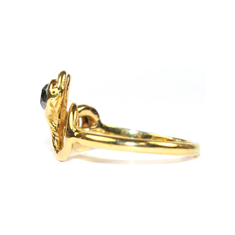 This unusual ring has a large old cut diamond set into the head of the snake which is curled around in a stylised lovers knot circle depicting the ouroborus.