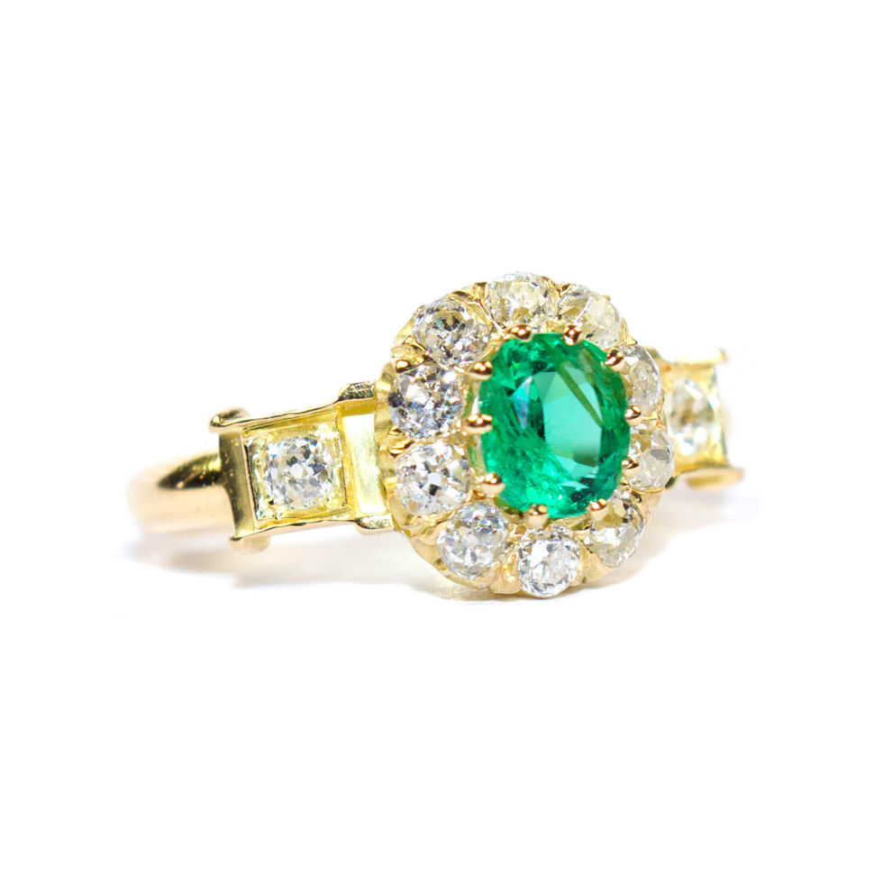 This lovely ring has a central oval-cut emerald within a border of old-cut diamonds. The gemstones are mounted in a fine claw setting with the emerald sitting higher in the setting. The cluster sits between two further old cut diamonds, each set within a square border to the shoulder.