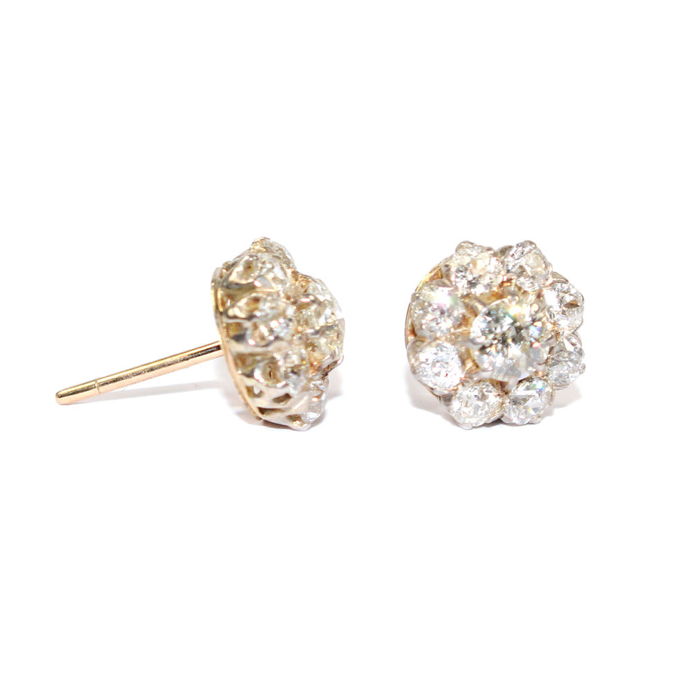These lovely earrings have a larger old cut diamond to the centre surrounded by a border of smaller old cut diamonds in a flower design. The diamonds are really well matched and are in a fine claw set mount giving the impression of one large diamond when seen from a distance.