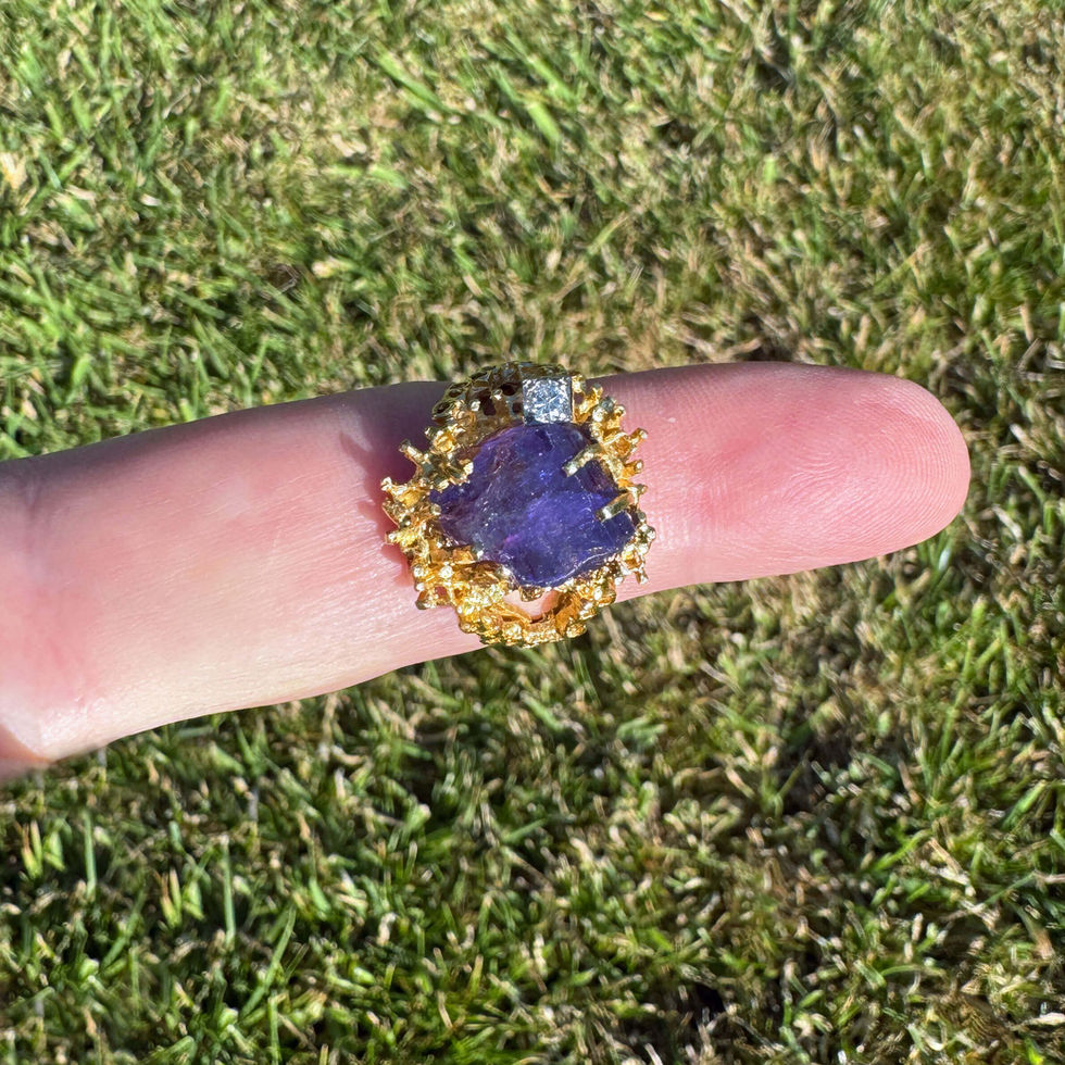This unusual and typically 1970's ring has a striated amethyst crystal to the centre in assymetric gold claws within a brutalist textured finish. The ring has a diamond accent to one side within a square box setting. The ring has split shoulders which flow onto a slightly tapered plain gold shank.