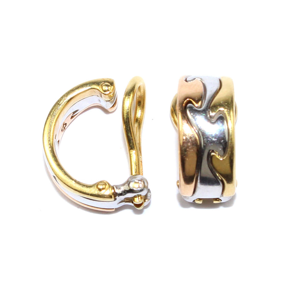 These contemporary 'Fusion' hoop earrings comprise 3 18ct gold panels in yellow, white and rose gold. Each metal is seamlessly fused together to create an almost swirl like effect.